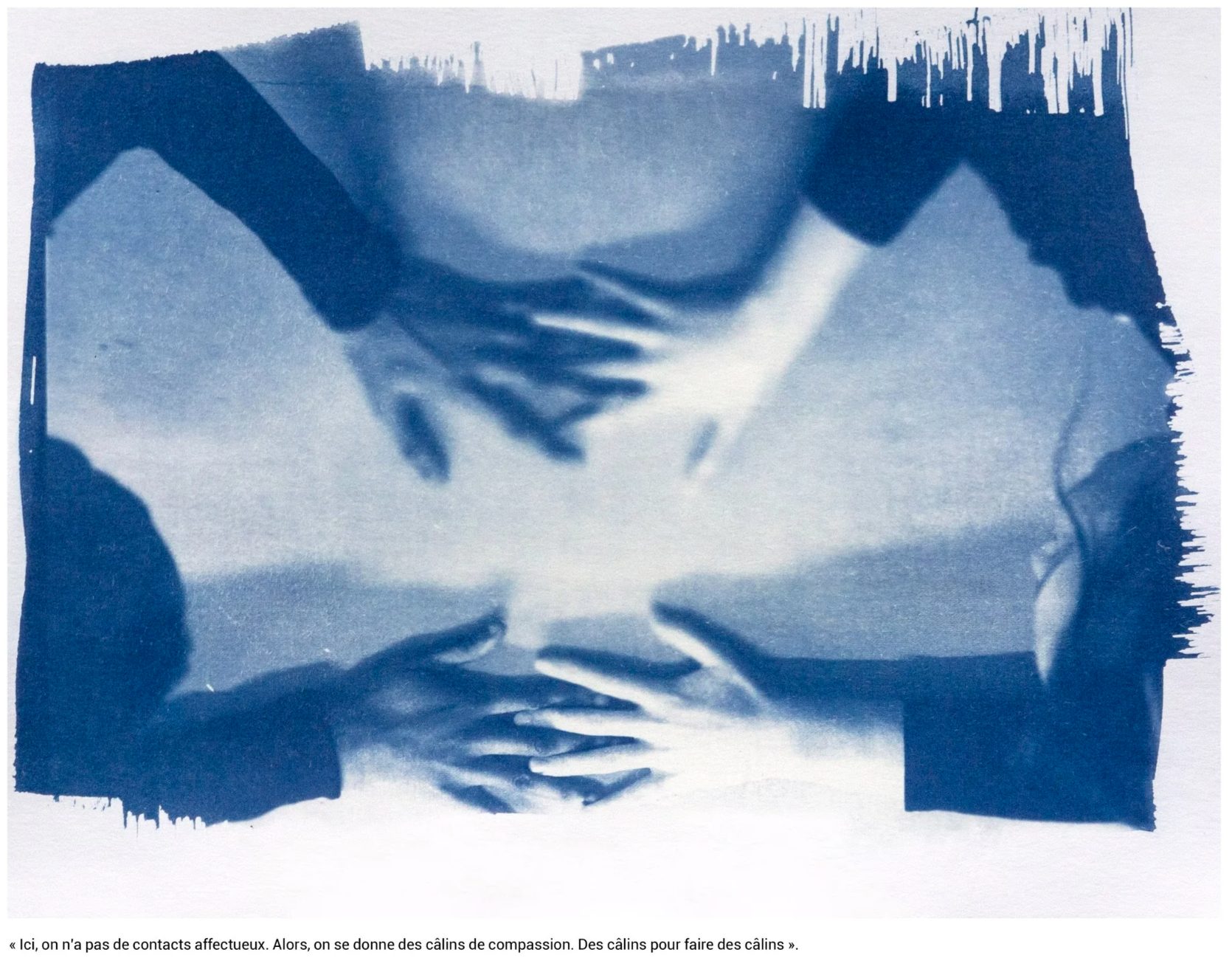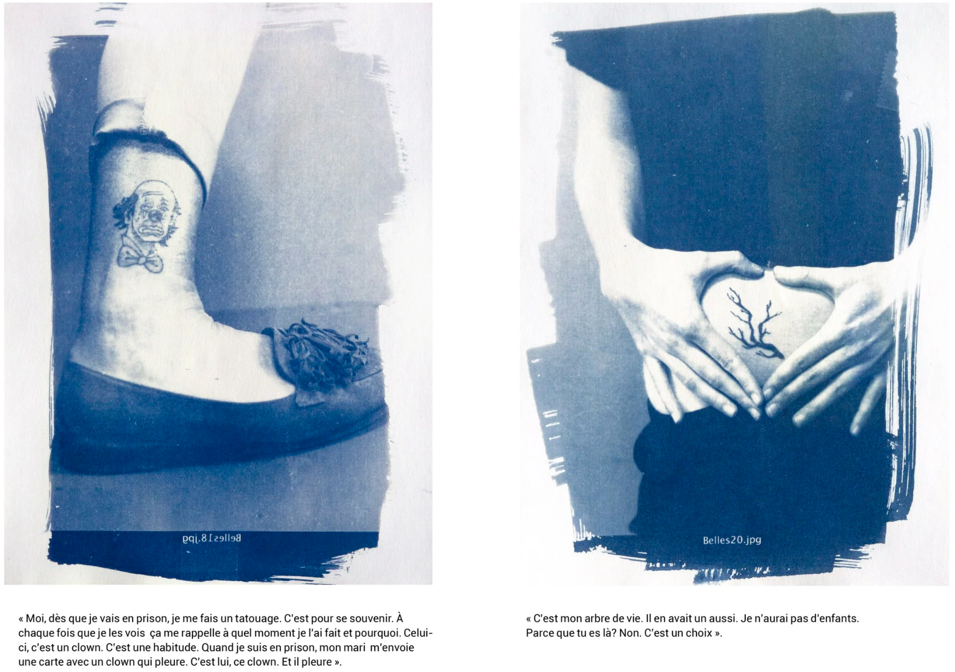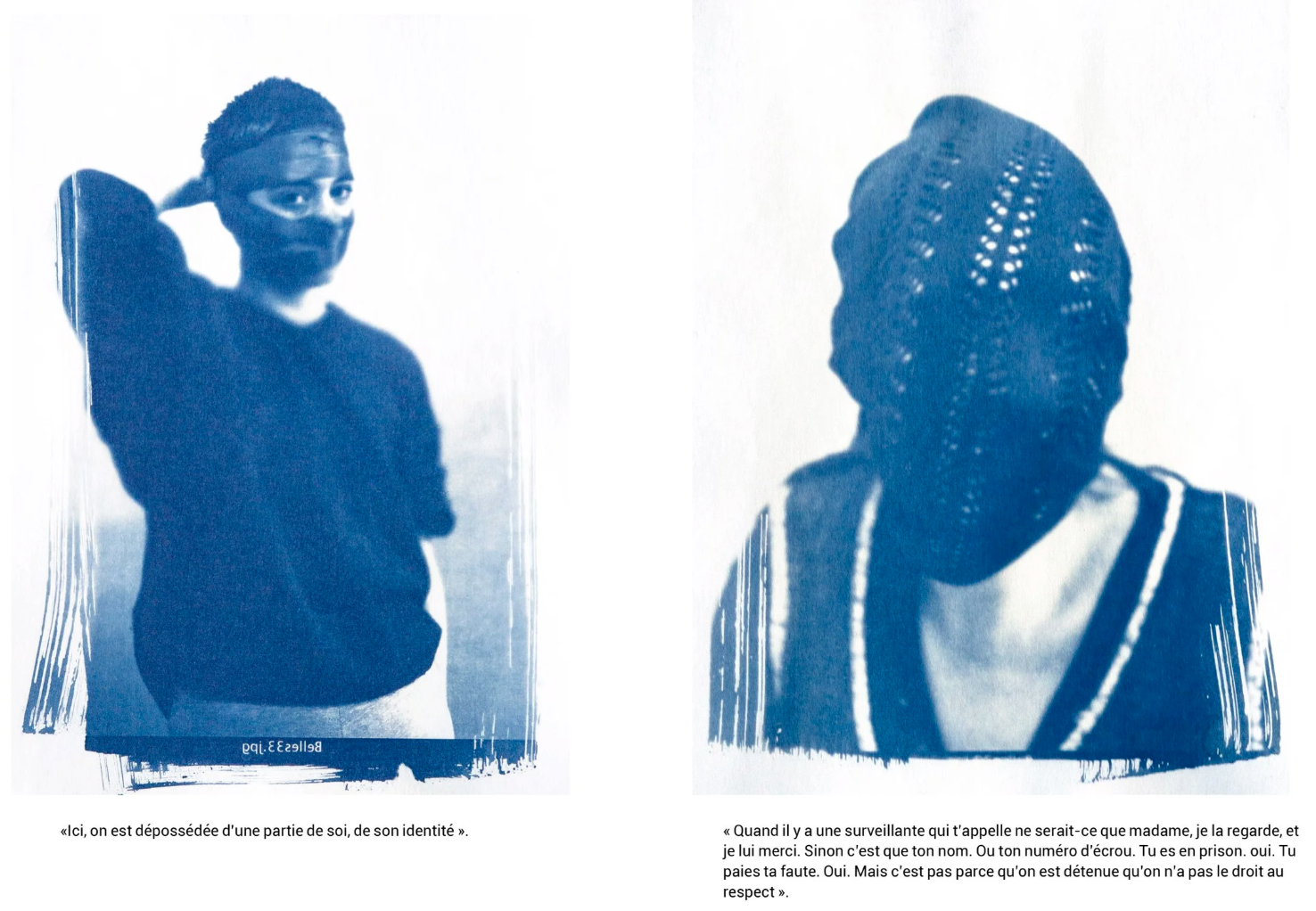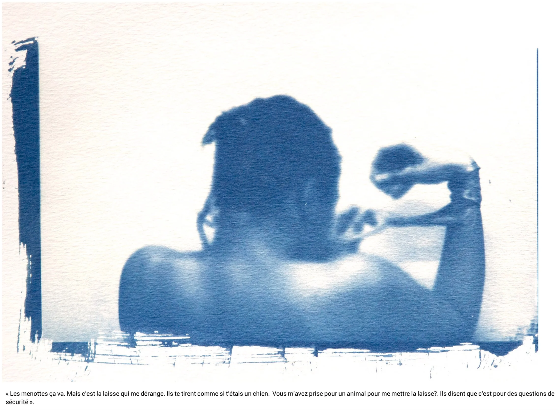 Elles ont parlé de la perte de leur féminité, de la disparition de leur corps derrière de larges habits et des préjugés. Lors des ateliers, elles ont joué avec leur image. Travail aux multiples mains, elles et moi avons photographié, puis développé les images, in situ, à l’aide de la technique du cyanotype. Elles ont pu emporter dans leurs cellules leurs images bleutées sur papier Canson. Les corps enfermés se sont peu à peu exprimés, apaisés. Et le temps d’un instant, retrouvés.