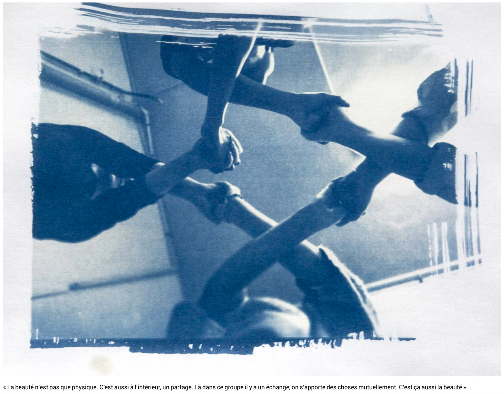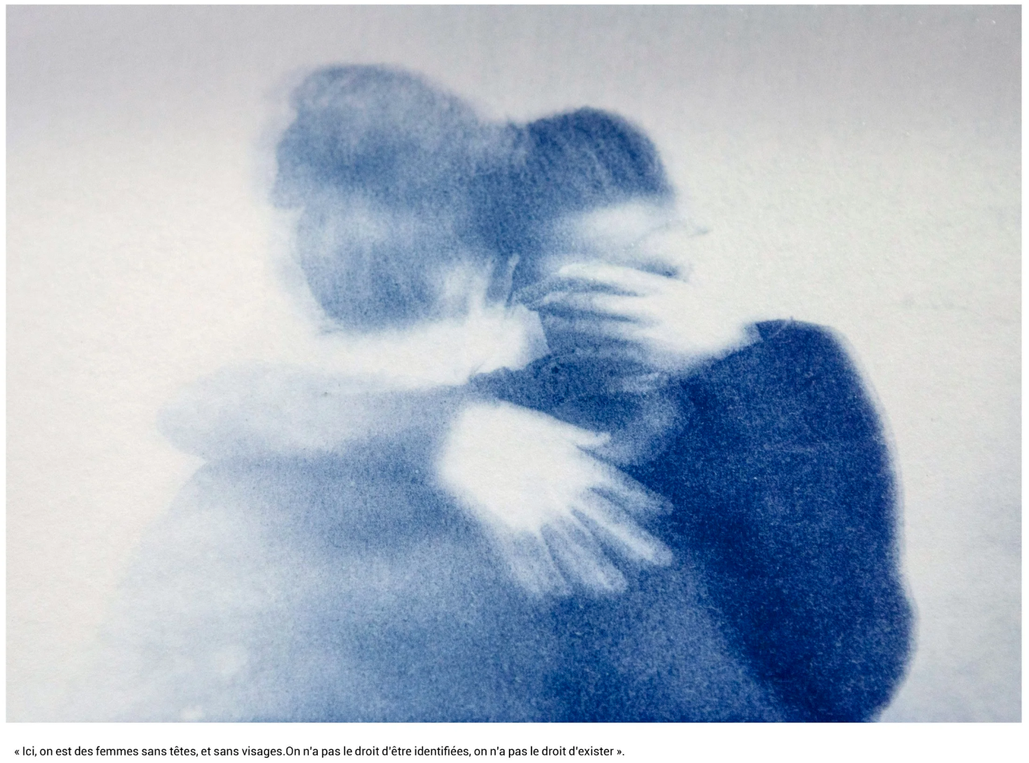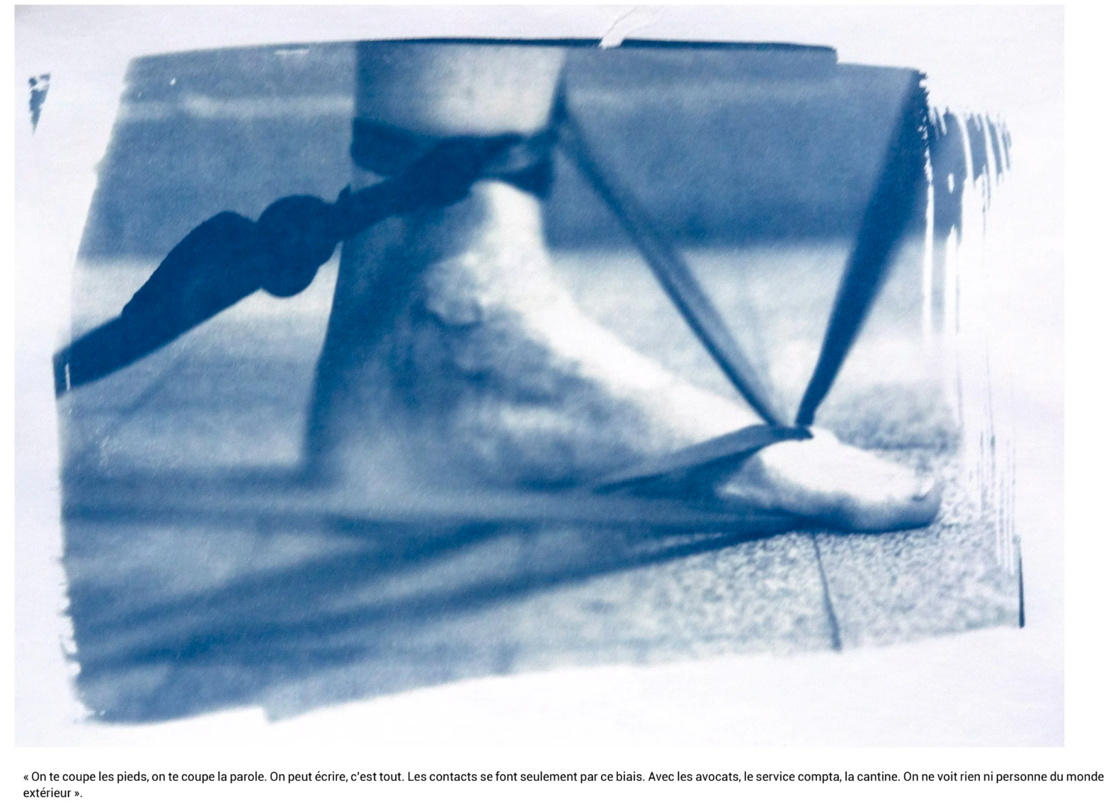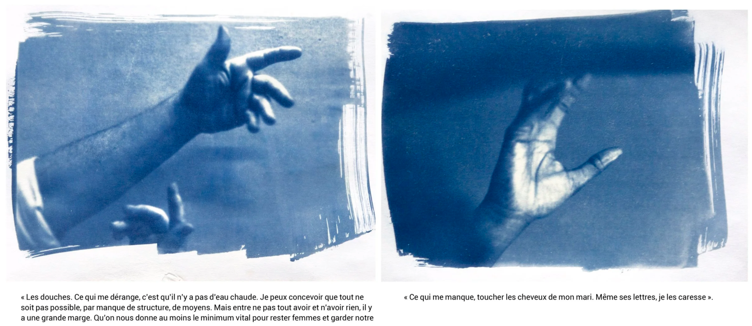 Elles ont parlé de la perte de leur féminité, de la disparition de leur corps derrière de larges habits et des préjugés. Lors des ateliers, elles ont joué avec leur image. Travail aux multiples mains, elles et moi avons photographié, puis développé les images, in situ, à l’aide de la technique du cyanotype. Elles ont pu emporter dans leurs cellules leurs images bleutées sur papier Canson. Les corps enfermés se sont peu à peu exprimés, apaisés. Et le temps d’un instant, retrouvés.