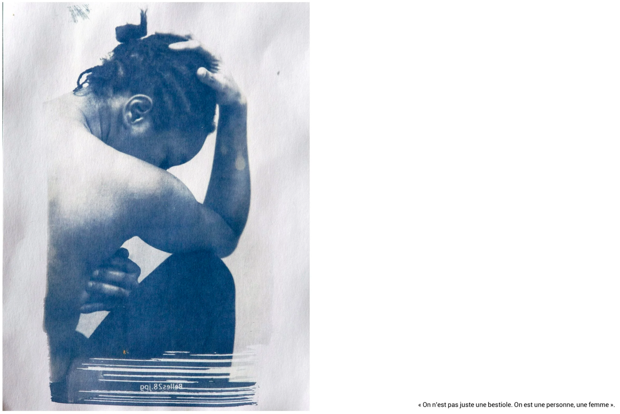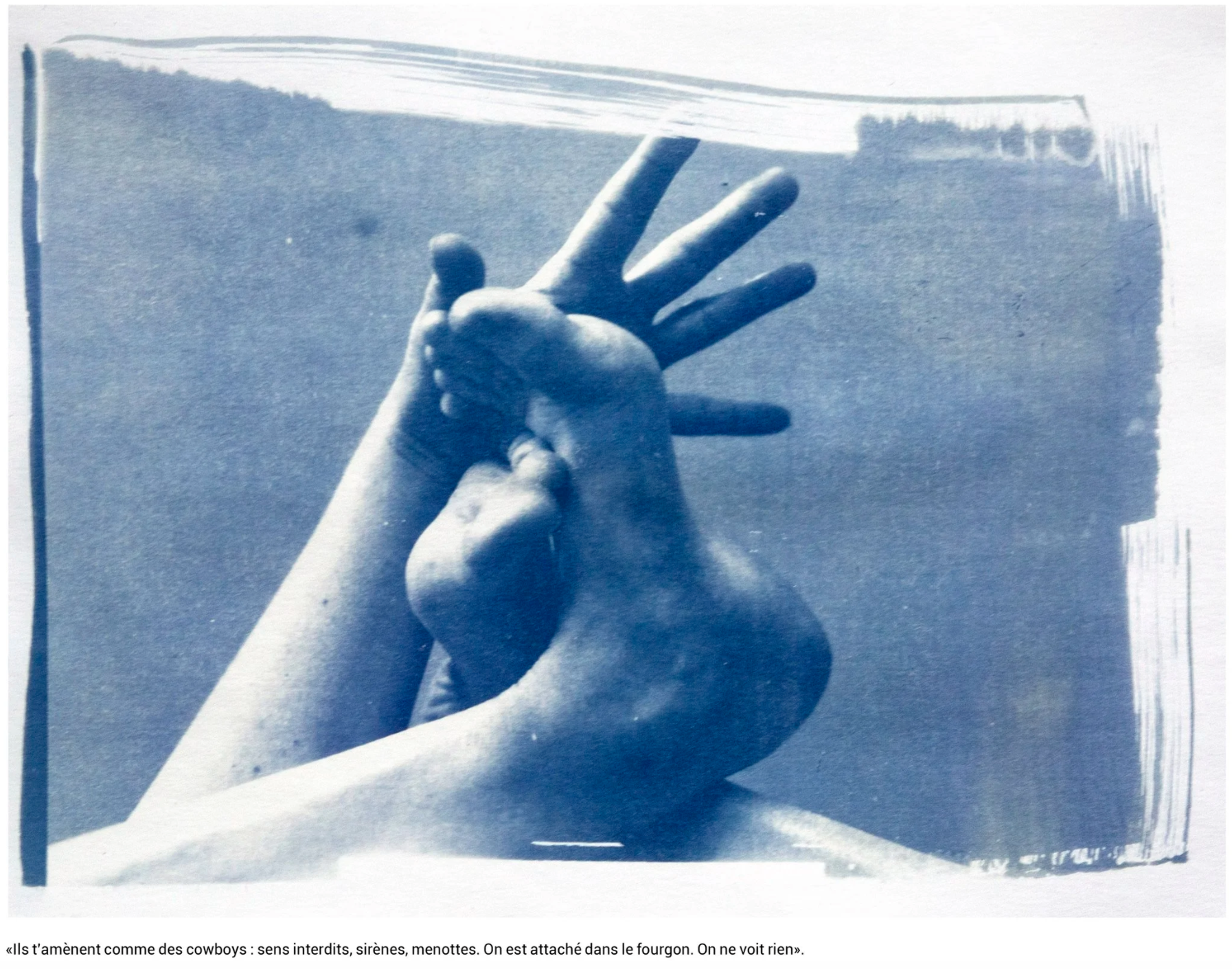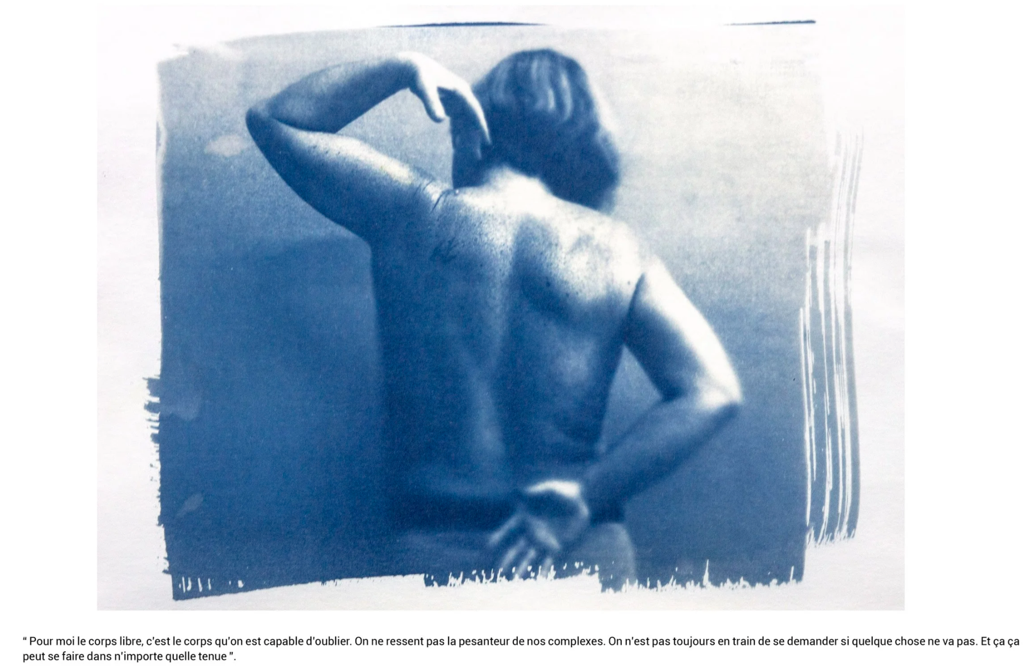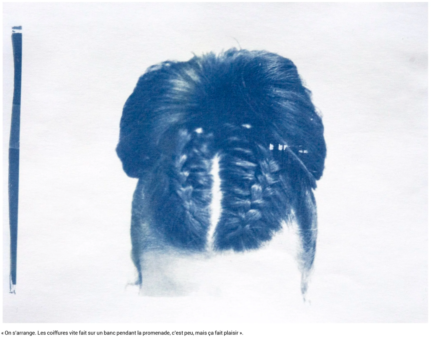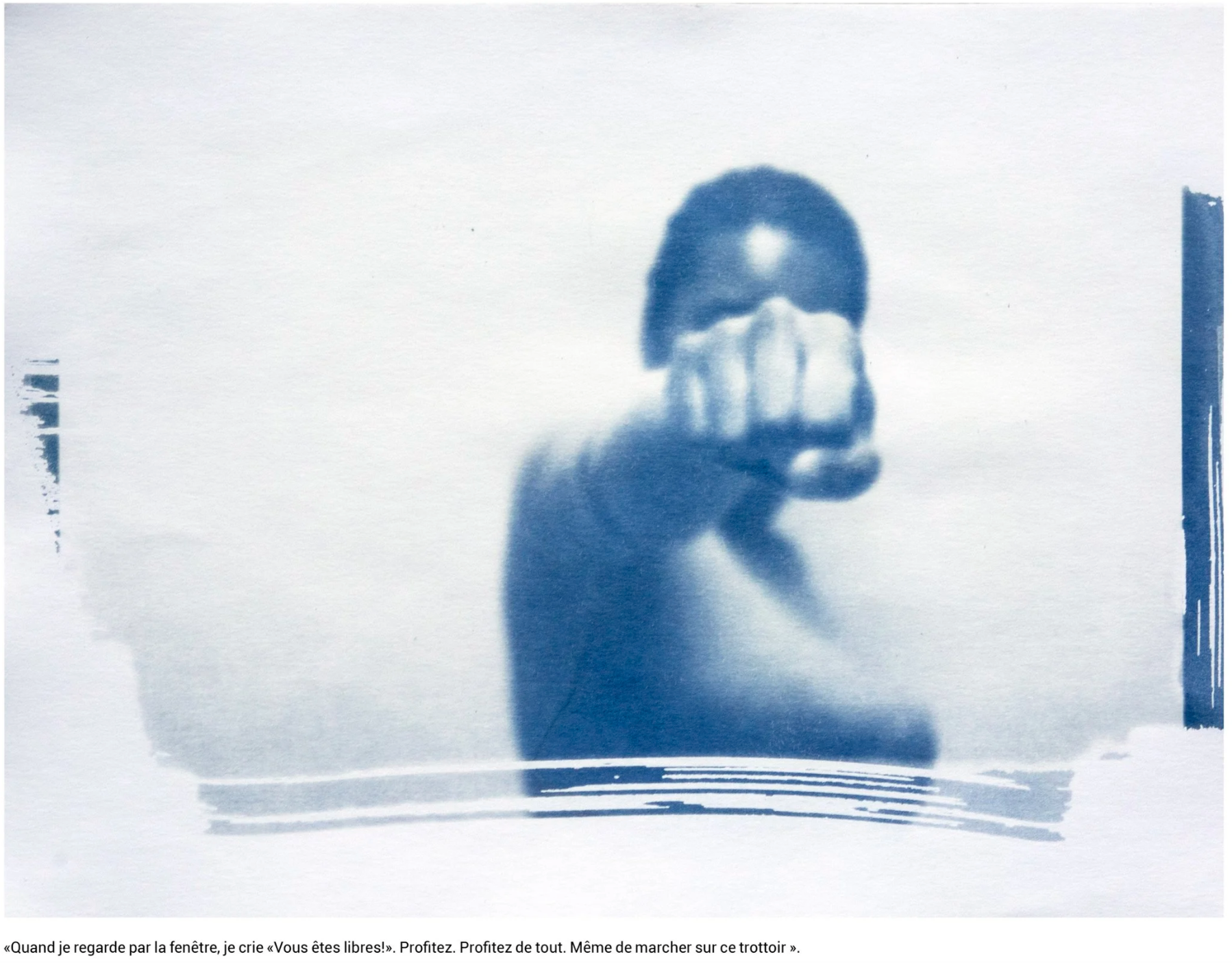 Elles ont parlé de la perte de leur féminité, de la disparition de leur corps derrière de larges habits et des préjugés. Lors des ateliers, elles ont joué avec leur image. Travail aux multiples mains, elles et moi avons photographié, puis développé les images, in situ, à l’aide de la technique du cyanotype. Elles ont pu emporter dans leurs cellules leurs images bleutées sur papier Canson. Les corps enfermés se sont peu à peu exprimés, apaisés. Et le temps d’un instant, retrouvés.
